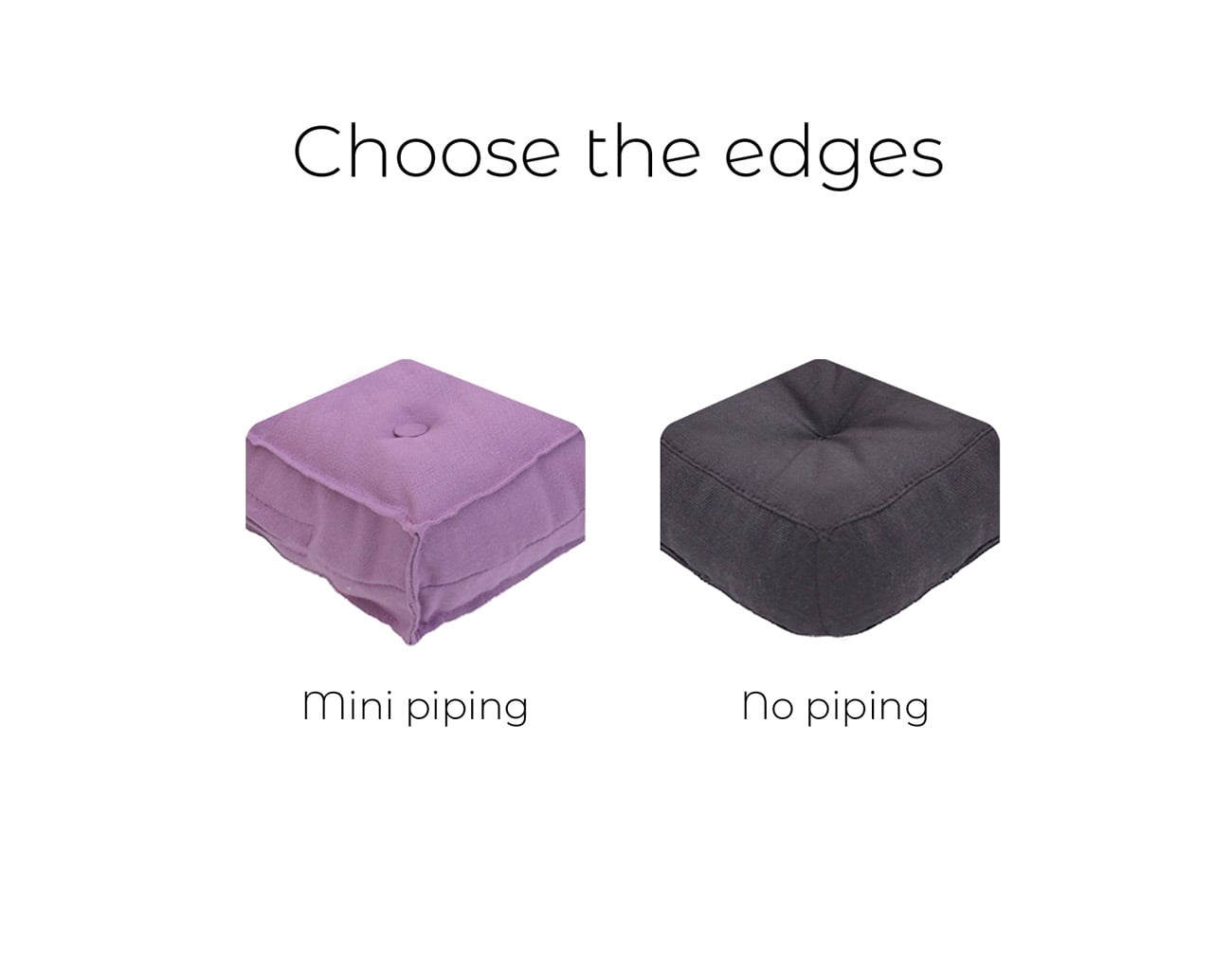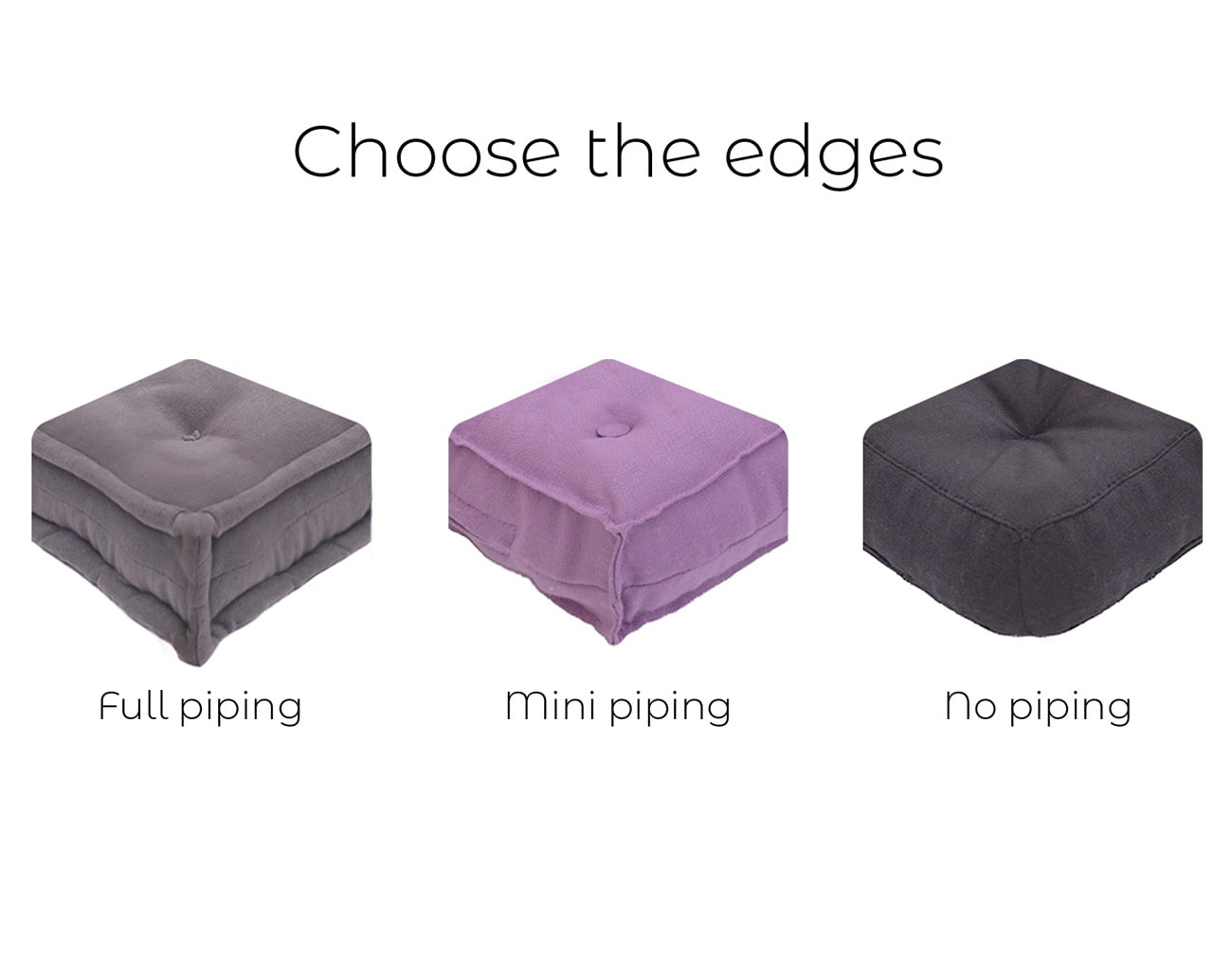 We offer three main kinds of edge design: thick piping, that keeps the mattress or the cushion more structured, thin piping, and no piping. Upon request, we can also do a double welted cushion with a rope piping design.