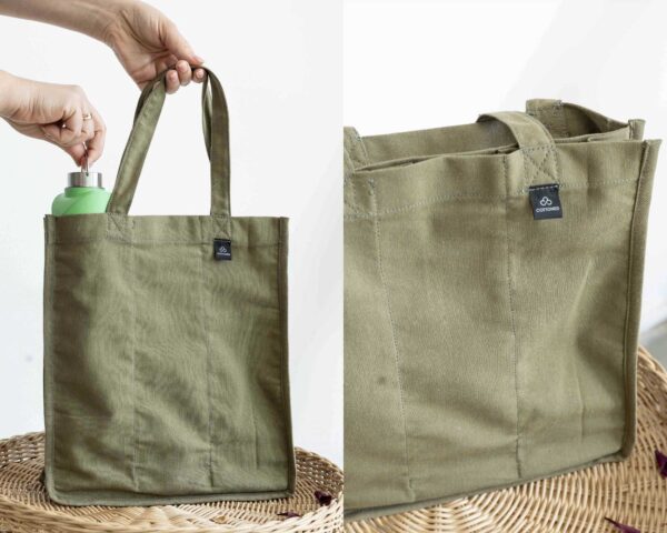 Crafted from fabric offcuts, the Cottoned Tote Bag is the perfect blend of sustainability and functionality. Featuring separate compartments inside for better organization, it’s ideal for keeping bottles, groceries, or other essentials neatly sorted while helping reduce waste.